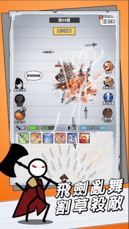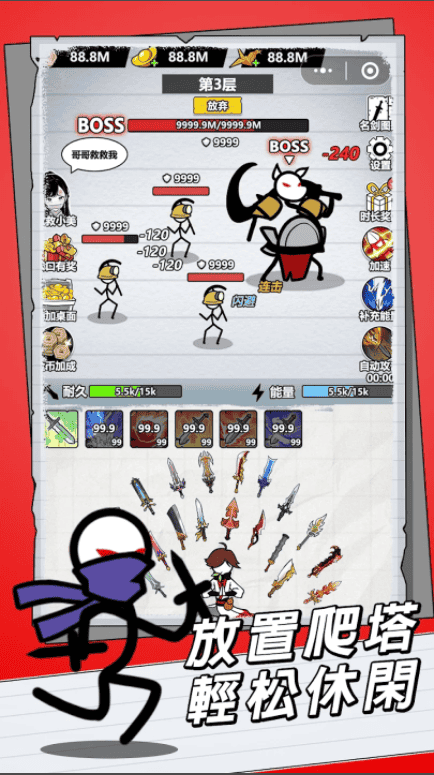 2. 玩家可自定义火柴人角色,通过收集不同的武功绝学和神兵利刃,增强角色实力。