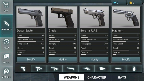 武器库提供多种枪械选择,包括冲锋枪、自动步枪、霰弹枪、狙击枪以及近战武器和手雷。